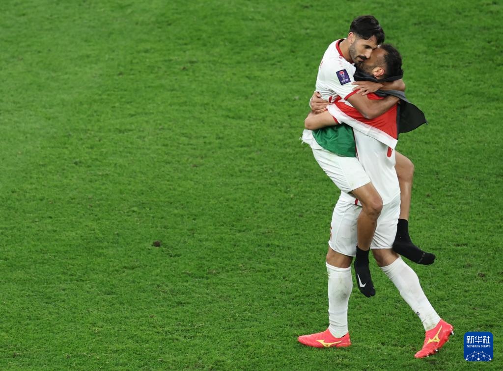 2月6日,約旦隊球員亞贊·奈瑪特(左)與隊友亞贊-阿拉伯在比賽后慶祝勝利。新華社記者 賈浩成 攝