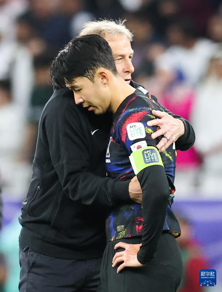 2月6日,韓國隊球員孫興慜(右)與主教練克林斯曼賽后擁抱。新華社記者 丁汀 攝
