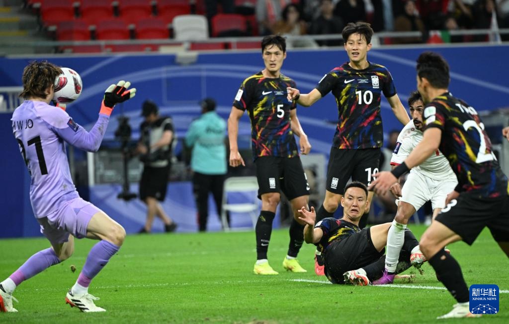 2月6日,韓國隊球員金英權(右二)在約旦隊打進本場比賽第二粒進球后。新華社記者 孫凡越 攝
