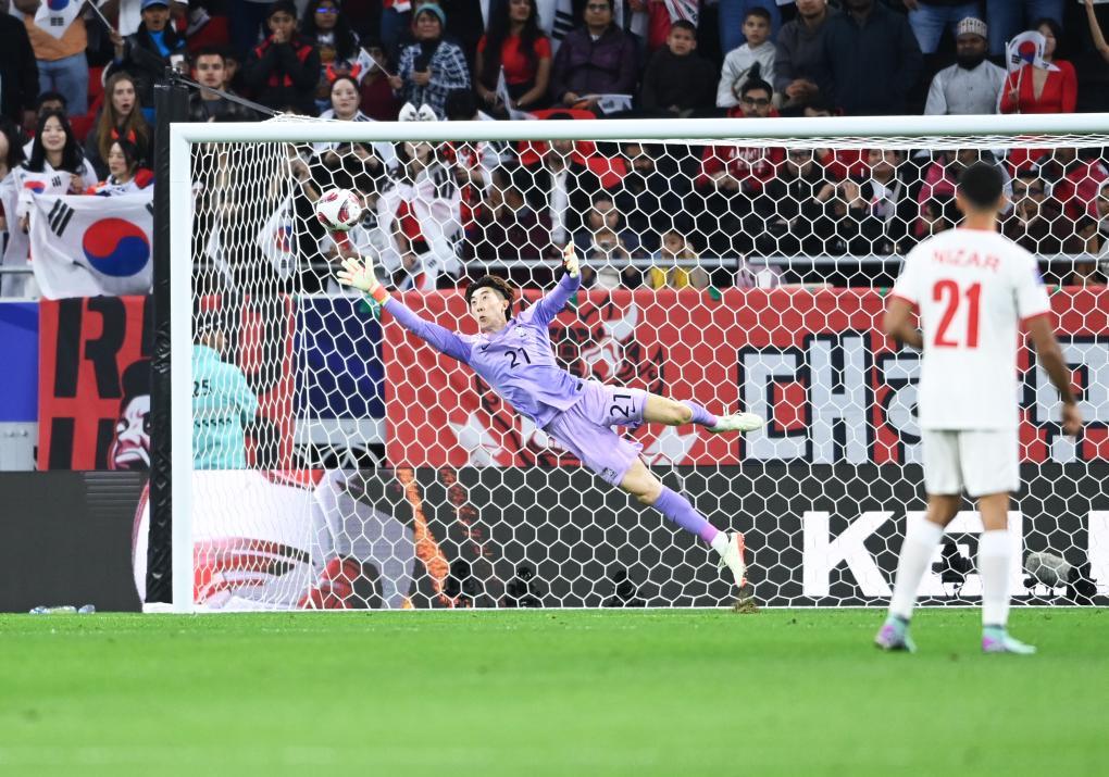 2月6日,韓國隊守門員趙賢祐在比賽中撲救。新華社記者 江漢 攝