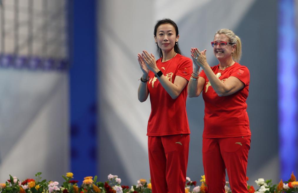 資料圖:2023年10月8日,中國隊教練張曉歡(左)、安娜在杭州亞運會的比賽中。新華社記者 王楷焱 攝