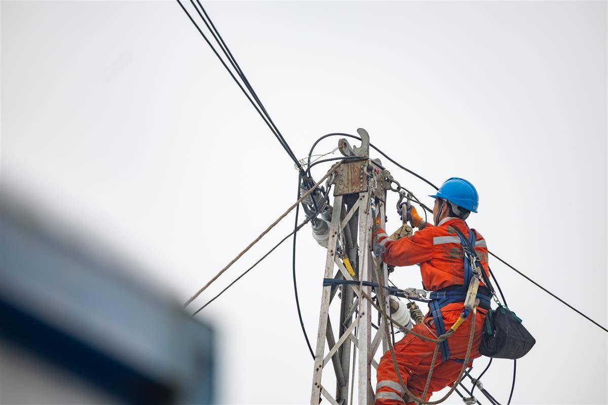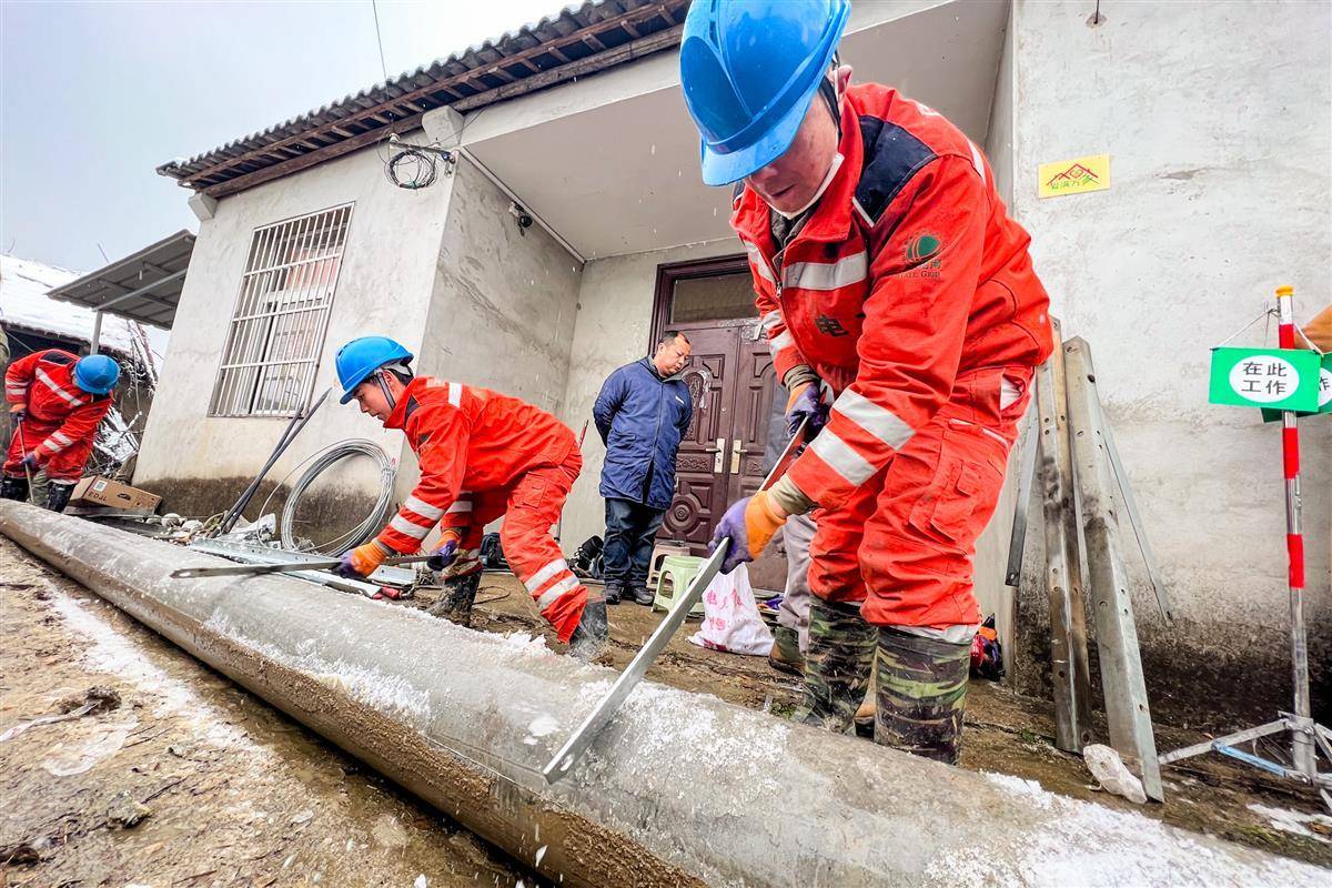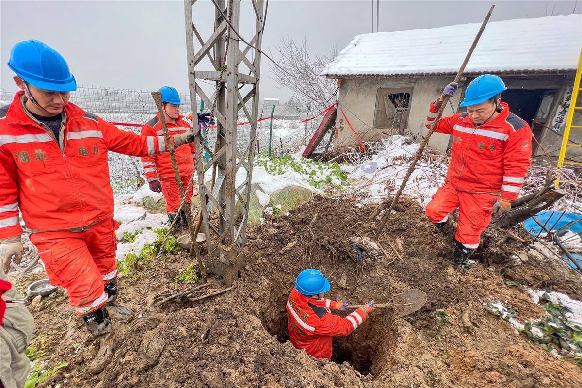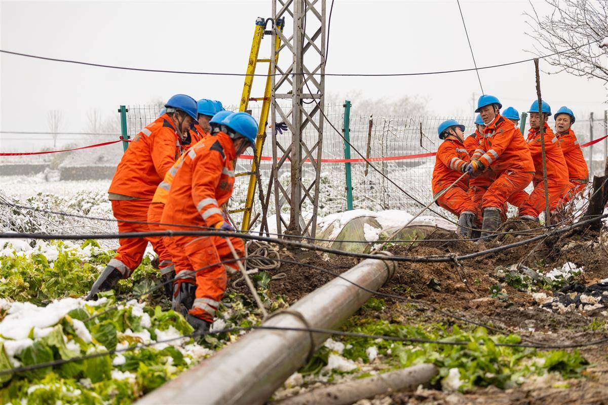 2024年2月6日,在武漢市江夏區鄭店街勞七村,國網武漢供電公司搶修隊正在加緊搶修。當日,受凍雨冰雪壓迫,江夏區鄭店街勞七村田間一電桿被壓彎,影響架設在此處的一條10千伏線路可靠運行,必須進行緊急搶修。為了給勞七村居民盡快恢復供電,該公司迅速組織搶修力量,在凌晨就抵達現場開展救援,在處理好現場的斷木和被壓倒的電桿之后,搶修隊快速豎起一座新電桿,為鄉村居民送去放心電。(湖北日報全媒記者 倪娜 通訊員 王欣 鄭靜 攝)