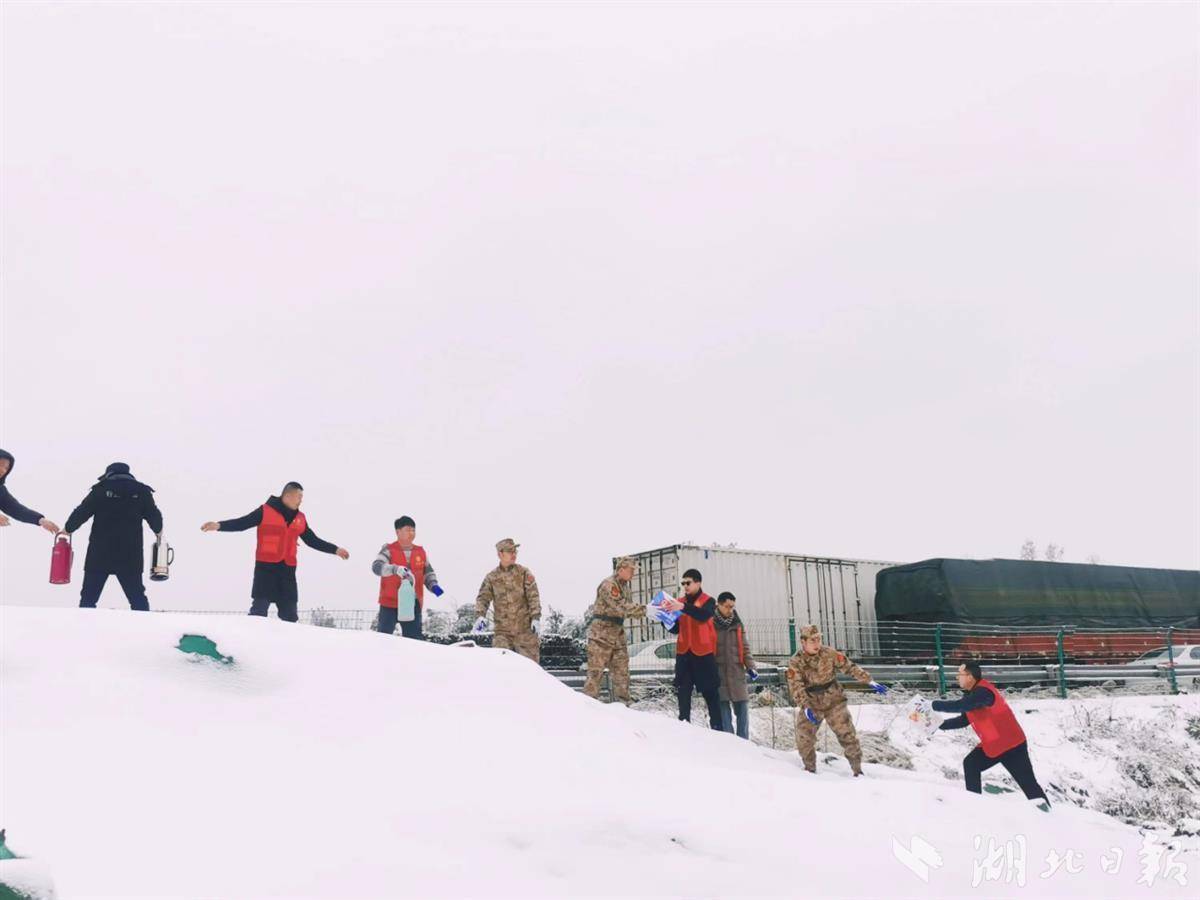 由于雨雪冰凍天氣,道路結(jié)冰,京港澳高速、武深高速蔡甸段出現(xiàn)大量車輛滯留情況,蔡甸區(qū)大集街道俞家垸村書記召集30余名黨員及志愿者從自家?guī)黹_水瓶,接力為高速公路上的滯留旅客送熱水、分發(fā)物質(zhì)。京港澳高速公路蔡甸段沿線蔡甸街道、奓山街道、中法城等單位200余名黨員群眾、志愿者,為滯留旅客送去方便面、面包、餅干、熱水、礦泉水等物資800余件。