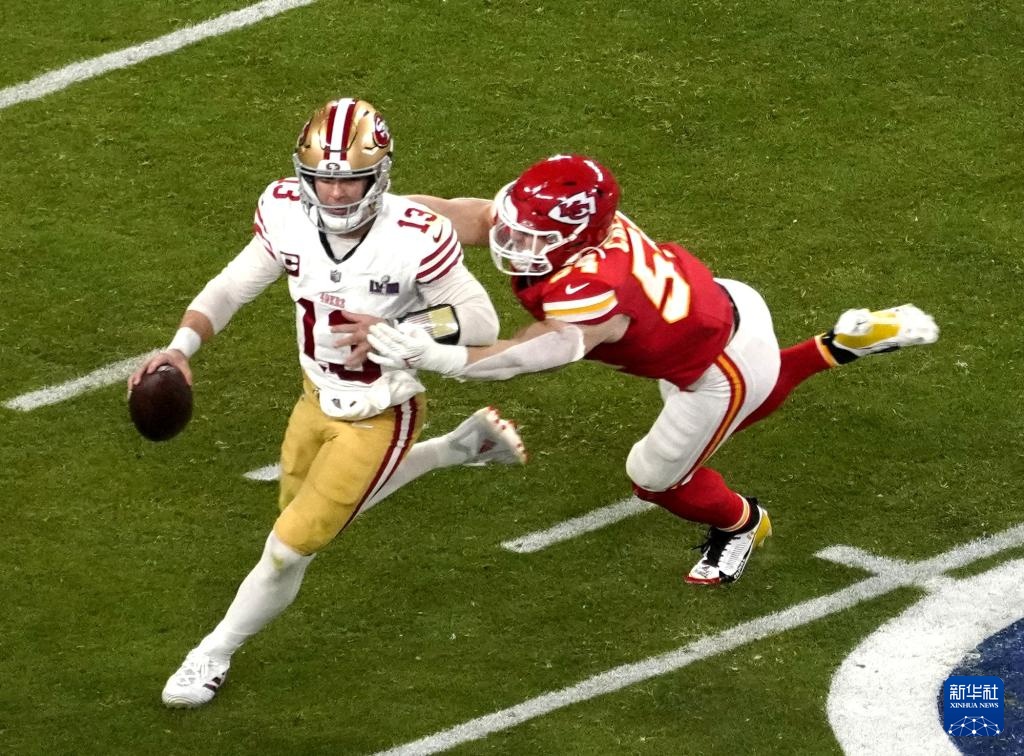 2月11日,舊金山49人隊球員布羅克·珀迪(左)在比賽中進攻。新華社記者 吳曉凌 攝