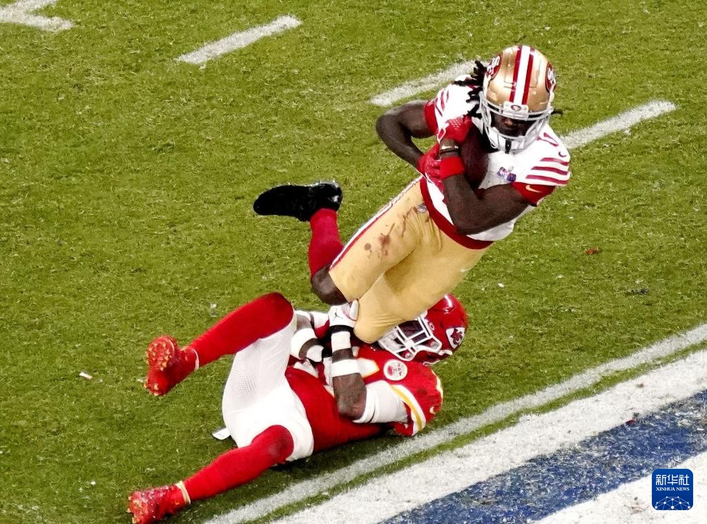 2月11日,舊金山49人隊員瑞安(右)防守堪薩斯城酋長隊球員拉希·賴斯。新華社記者 吳曉凌 攝