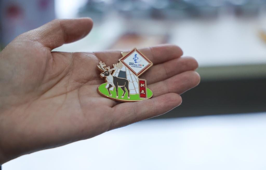 ↑1月10日拍攝的馴鹿和撮羅子主題的“十四冬”呼倫貝爾民俗徽章。新華社記者 王楷焱 攝