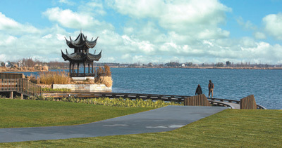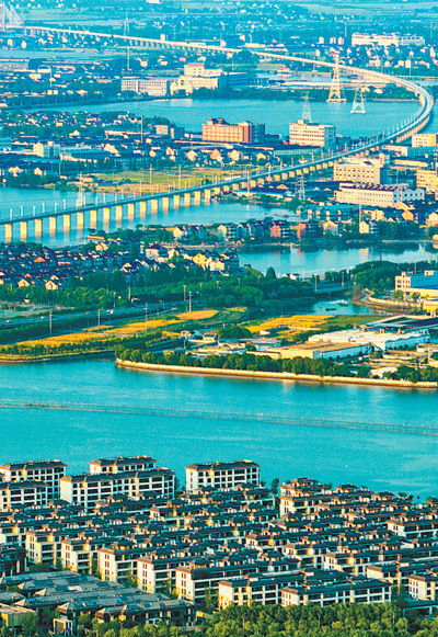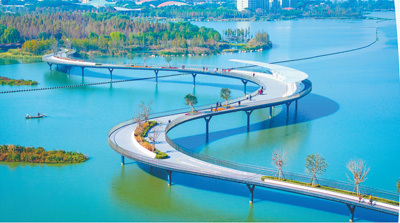 示范區加強生態環境綜合治理,以太浦河、淀山湖、元蕩、汾湖“一河三湖”為重點,大力推進岸線綜合整治。圖為橫跨滬蘇兩地的元蕩慢行橋。 上海青浦區委宣傳部供圖 |