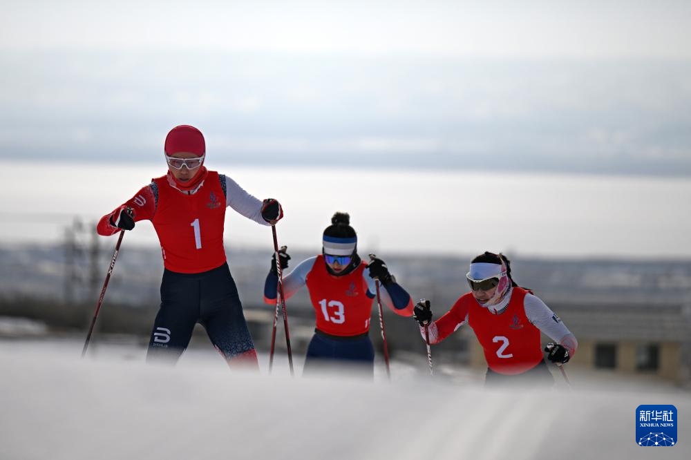 2月14日,黑龍江選手池春雪(右)、新疆選手迪妮格爾·衣拉木江(中)、黑龍江選手李馨在比賽中。最終她們分別獲得冠、亞、季軍。