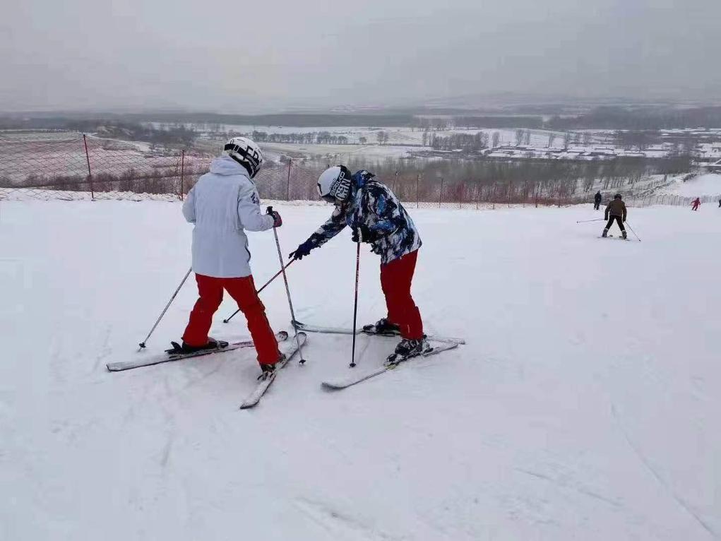 內蒙古興安盟科爾沁右翼前旗居力很鎮紅心村的村民(右)作為教練正在教游客滑雪。采訪者供圖