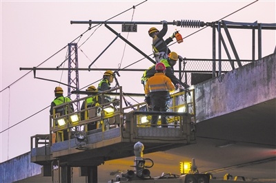 春節假期,國鐵武漢局襄陽供電段職工在襄陽火車站清洗相關設備。 楊 東攝(人民視覺) |