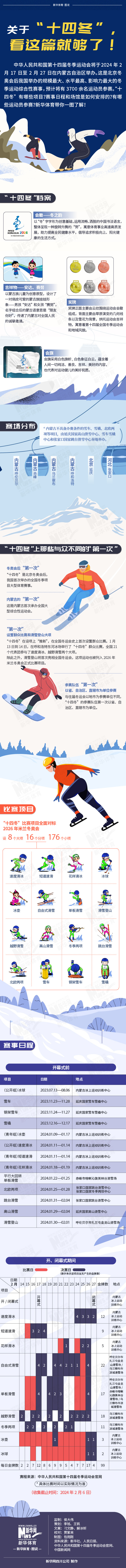 中華人民共和國第十四屆冬季運動會將于2024年2月17日至2月27日在內蒙古自治區舉辦。這是北京冬奧會后我國舉辦的規模最大、水平最高、影響力最大的冬季運動綜合性賽事,預計將有3700余名運動員參賽。“十四冬”有哪些項目?賽事日程和場館是如何安排的?有哪些運動員參賽?新華體育帶你一圖了解!