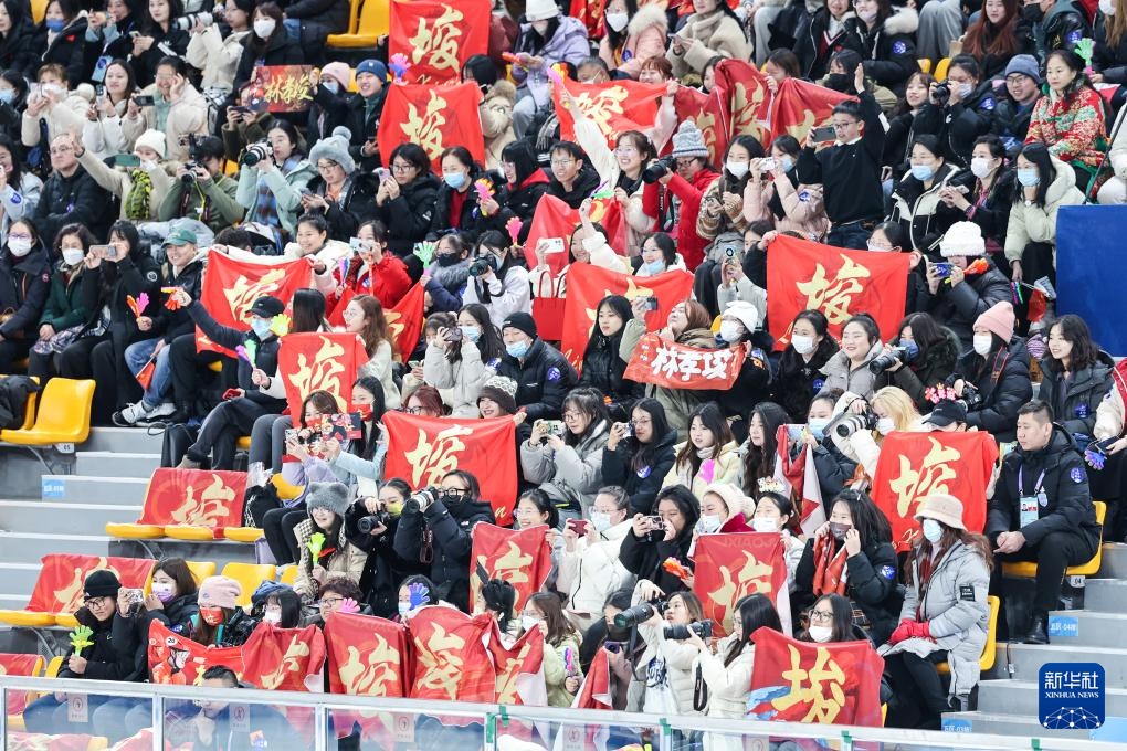 2月15日,觀眾在男子1500米四分之一決賽中為選手們加油。