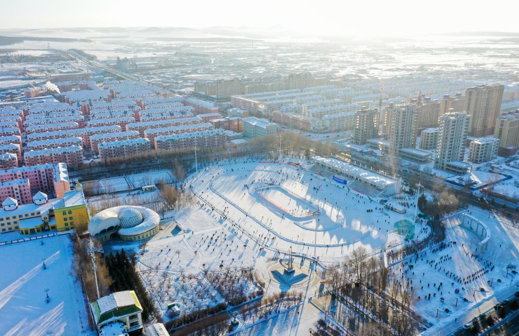↑人們在牙克石市體育場滑冰(無人機照片,2021年1月19日攝)。