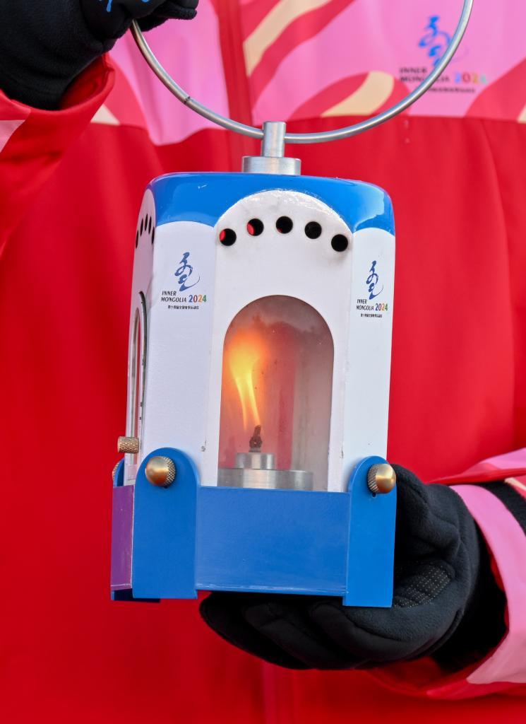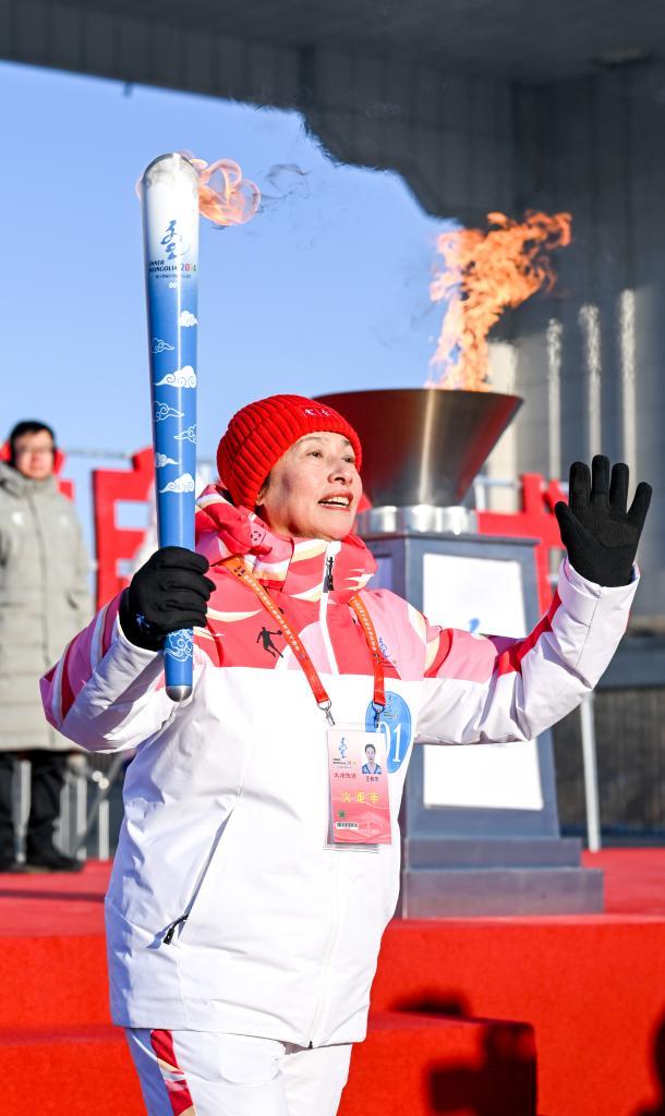 ↑2024年2月3日,在內蒙古呼倫貝爾市滿洲里國門景區,第一棒火炬手王桂芳在火炬傳遞活動中。