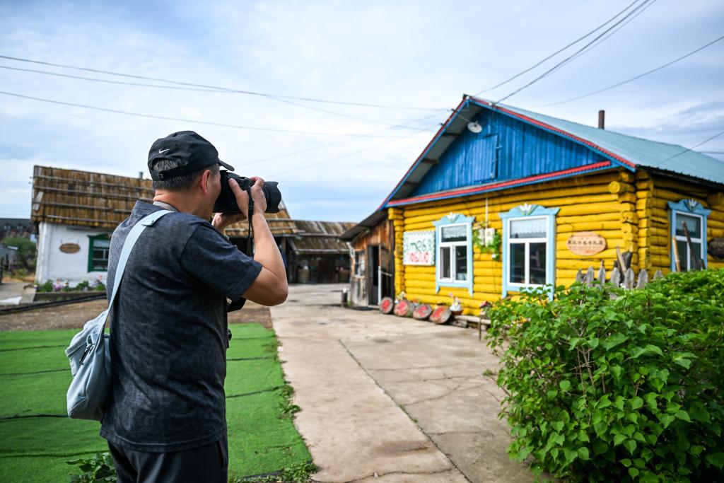 ↑一名游客在蒙兀室韋蘇木拍攝俄式傳統民居(2023年6月28日攝)。
