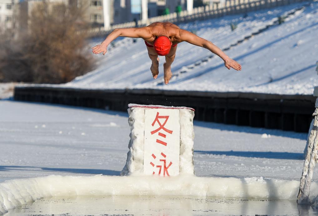 ↑閆相斌跳進泳池(2021年1月22日攝)。