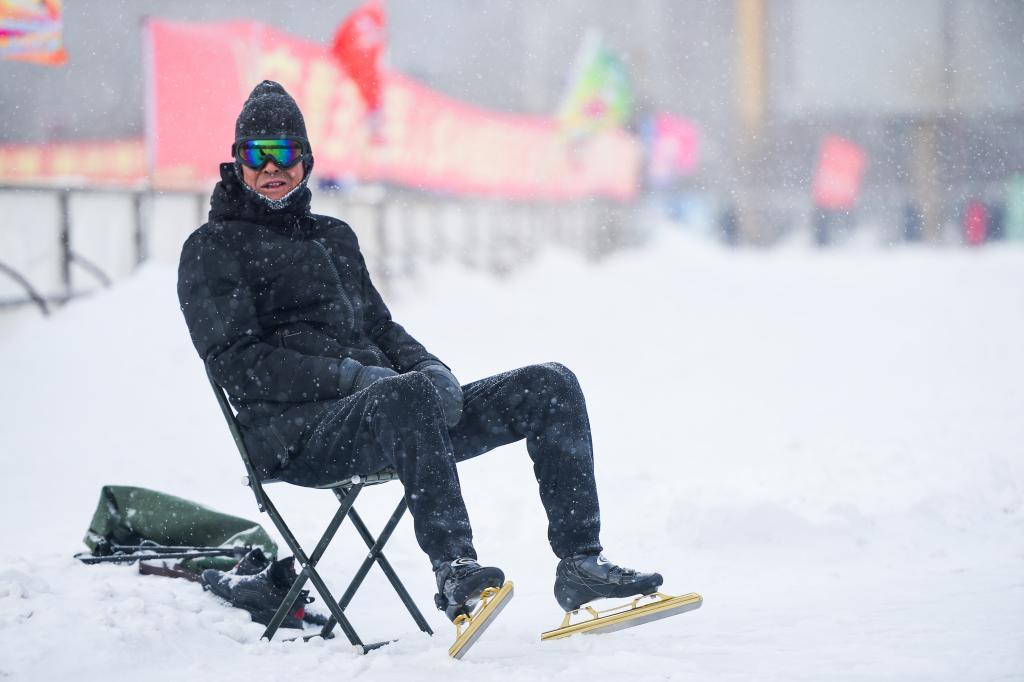↑王全利在滑冰間隙休息(2021年1月20日攝)。