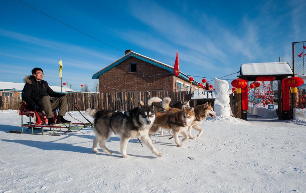 ↑游客在金河冷極村乘狗拉雪橇游覽(2015年12月20日攝)。
