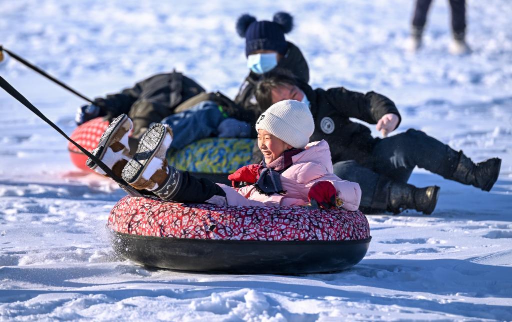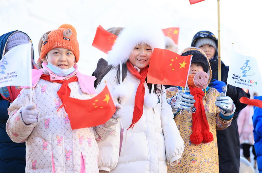 ↑2024年1月19日,孩子們參加雪地拉爬犁比賽。