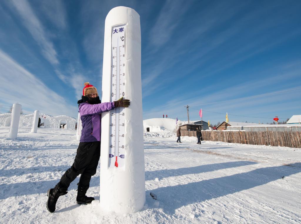 ↑一名游客在金河冷極村拍照留念(2015年12月20日攝)。