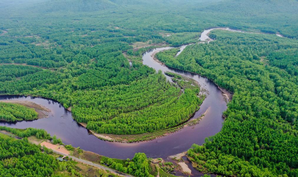↑內蒙古呼倫貝爾根河源國家濕地公園景色(無人機照片,2021年6月8日攝)。