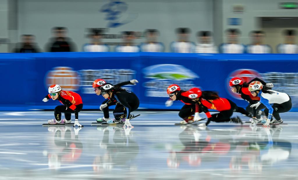 ↑2024年1月12日,選手在短道速滑(青年組)女子1500米A組決賽中。