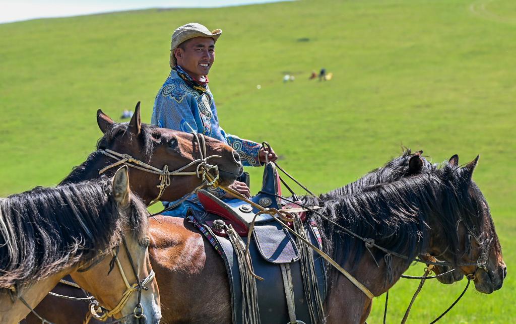 ↑一位牧民在第二屆內蒙古呼倫貝爾大草原文化旅游節上進行牧馬表演(2023年7月1日攝)。