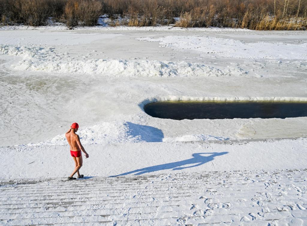 ↑閆相斌前往泳池冬泳(2021年1月22日攝)。