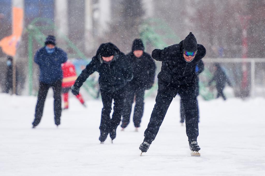 ↑王全利(右前)在牙克石市體育場滑冰(2021年1月20日攝)。