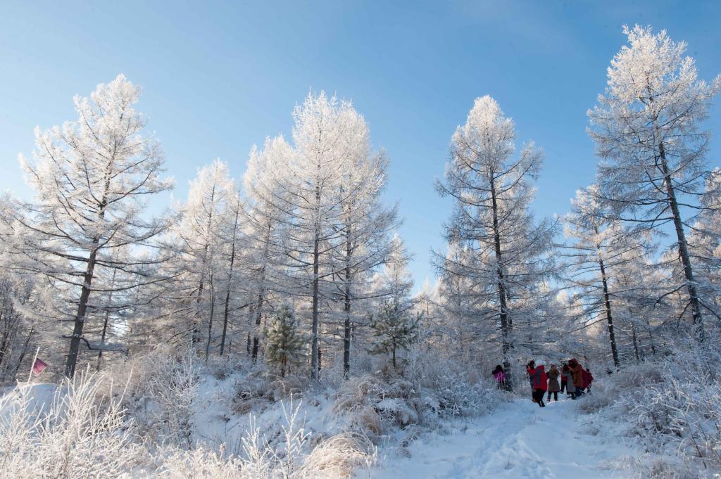 ↑游客們在大興安嶺腹地拍攝霧凇(2015年12月20日攝)。