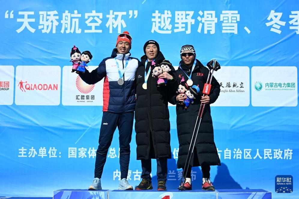 2月16日,冠軍程方明(中)、亞軍閆星元(左)和季軍烏罕圖在頒獎儀式上合影。新華社記者 陳振海 攝