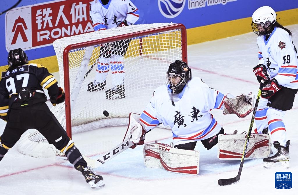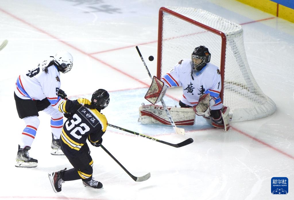 當日,在內(nèi)蒙古冰上運動訓(xùn)練中心冰球館舉行的第十四屆全國冬季運動會冰球項目女子青年組小組循環(huán)賽B組比賽中,遼寧隊3比2戰(zhàn)勝廣東隊。