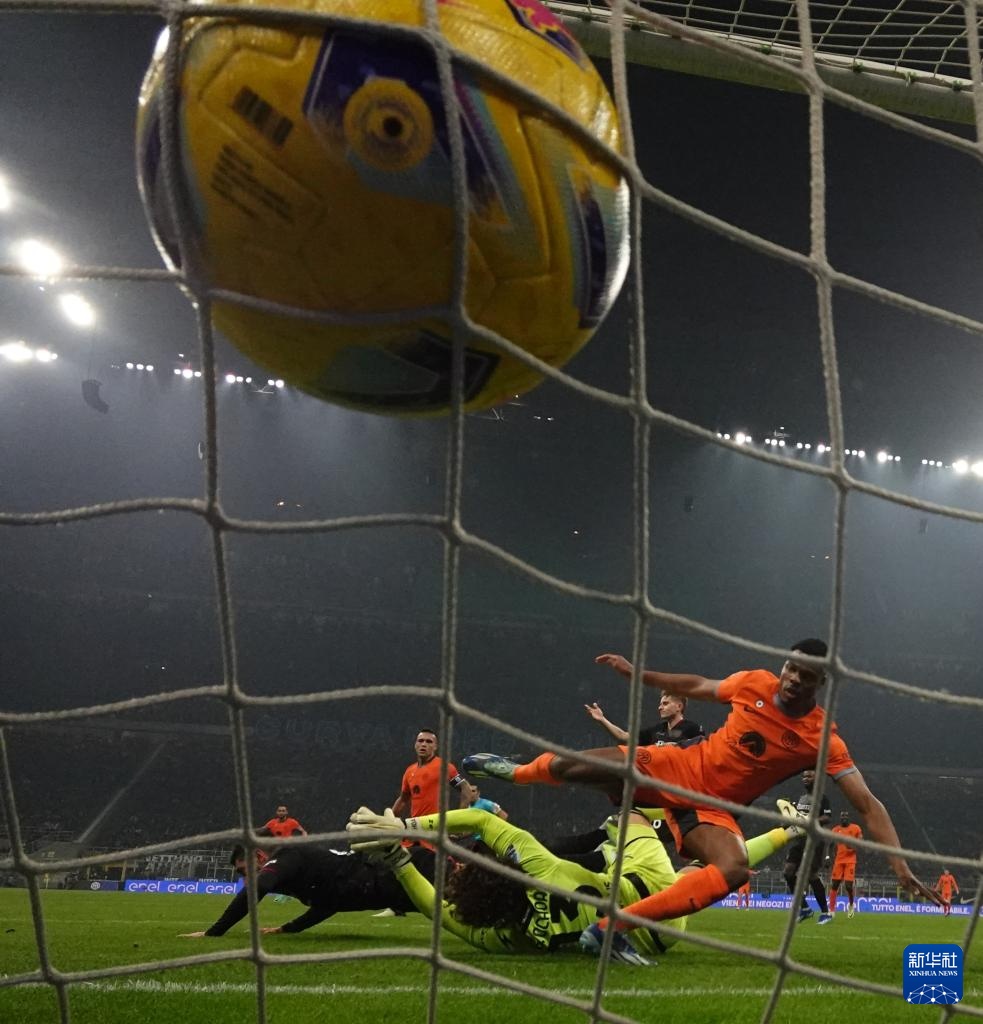 2月16日,國際米蘭隊球員鄧弗里斯(右一)在比賽中射門得分。新華社發(fā)(阿爾貝托·林格利亞攝)
