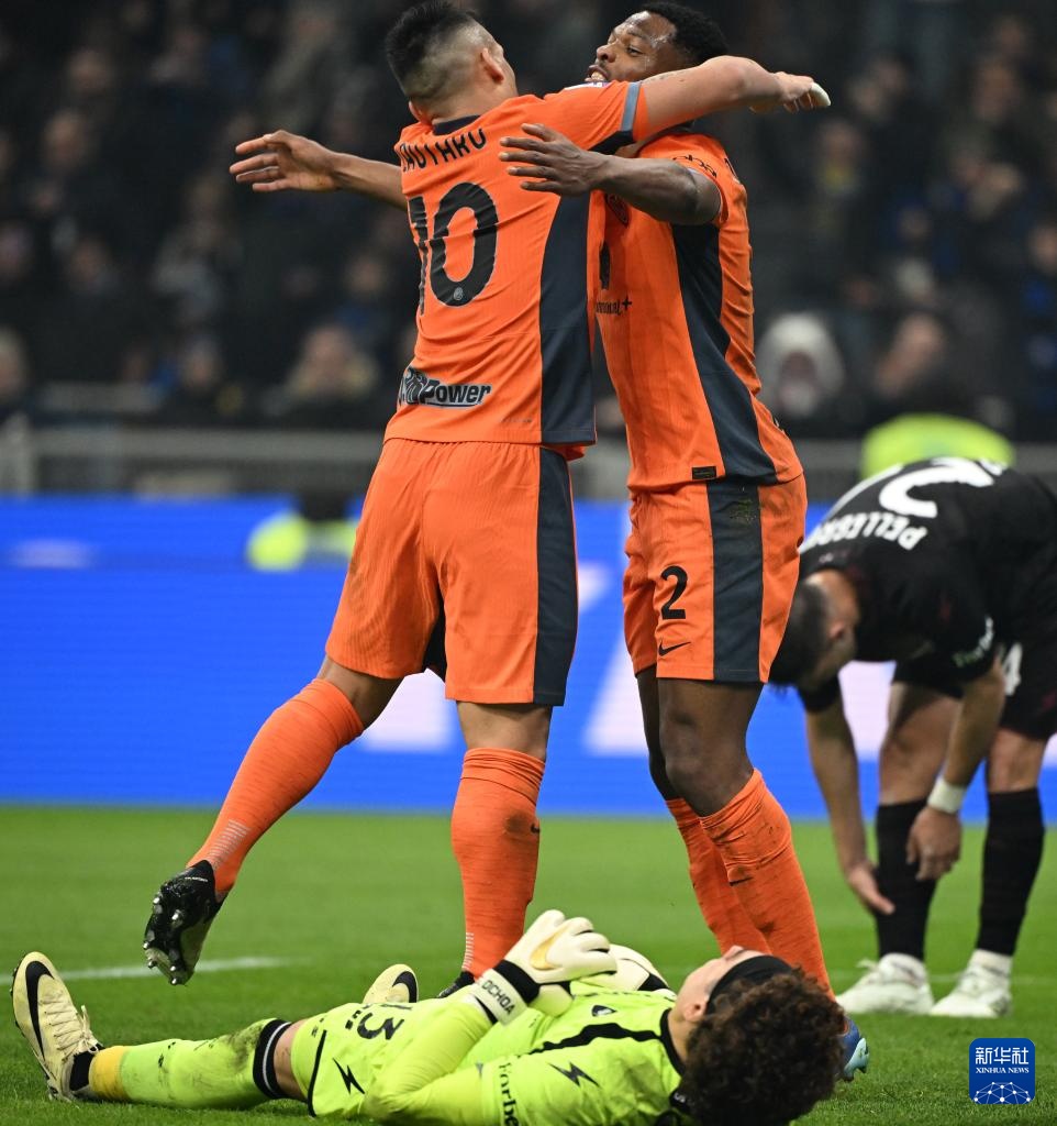 2月16日,國際米蘭隊球員勞塔羅(右)在進球后與隊友圖拉姆(中)慶祝。新華社發(fā)(阿爾貝托·林格利亞攝)