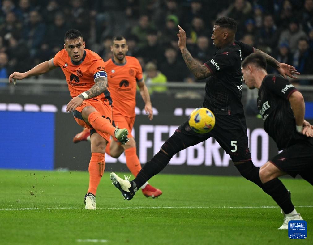 2月16日,國際米蘭隊球員勞塔羅(左一)在比賽中射門得分。新華社發(fā)(阿爾貝托·林格利亞攝)