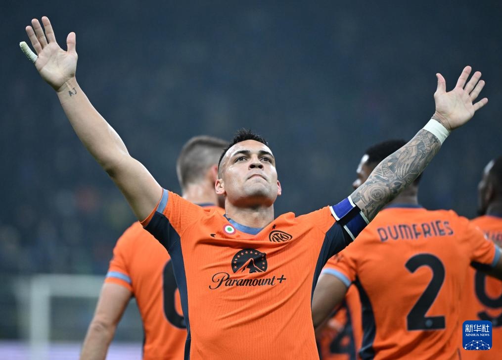 2月16日,國際米蘭隊球員勞塔羅慶祝進球。新華社發(fā)(阿爾貝托·林格利亞攝)