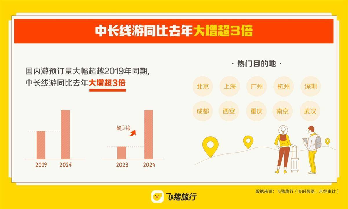 8天假期疊加不少單位除夕放假,龍年春節假期游客的出游距離和出游時間雙雙拉長,其中中長線游同比去年大增超3倍,自由行的平均旅行日期較去年提升30%。出境游也創下近4年峰值,預訂量同比去年大增近10倍,過半數的熱門海外目的地已超越2019年同期。《快報》顯示,國內游南北流動趨勢明顯,其中飛往廣東、海南、福建等南方地區溫暖過年的“避寒游”,以及飛往黑龍江、吉林、河北等北方地區的“過雪年”最為火爆,預訂量同比去年增長105%。另外,“古都游”這個假期也備受青睞,預訂量同比去年增長115%。