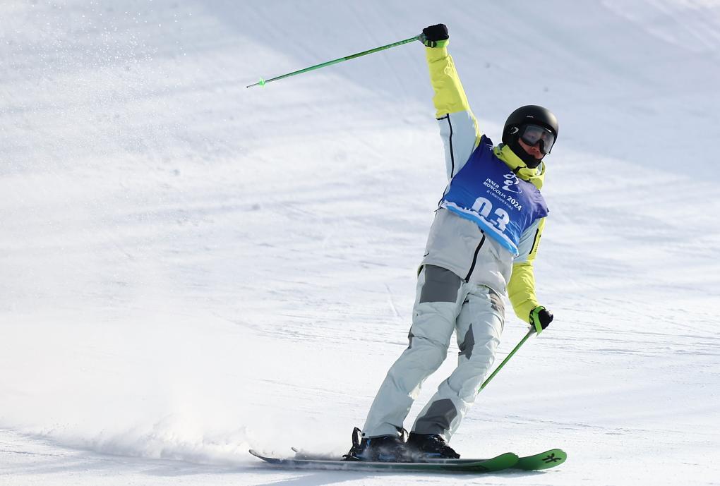 2月17日,內蒙古隊選手楊昊在比賽中慶祝,他以174.75分的成績獲得冠軍。新華社記者 王楷焱 攝