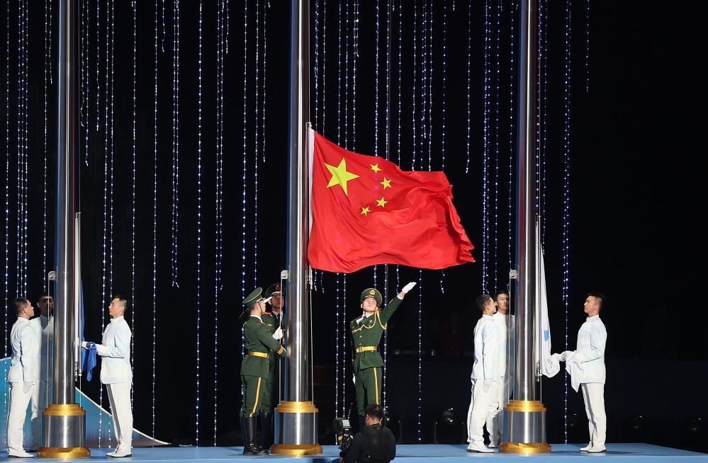 2月17日,中華人民共和國國旗在開幕式上升起。新華社記者 姜帆 攝