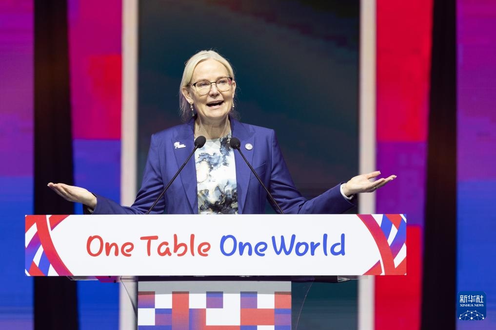 2月17日,國際乒聯(lián)主席佩特拉·索林在開幕式上講話。新華社記者 張濤 攝