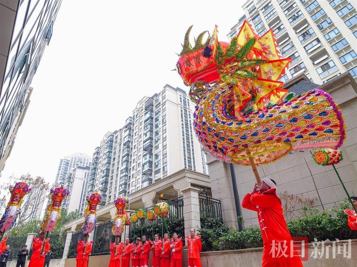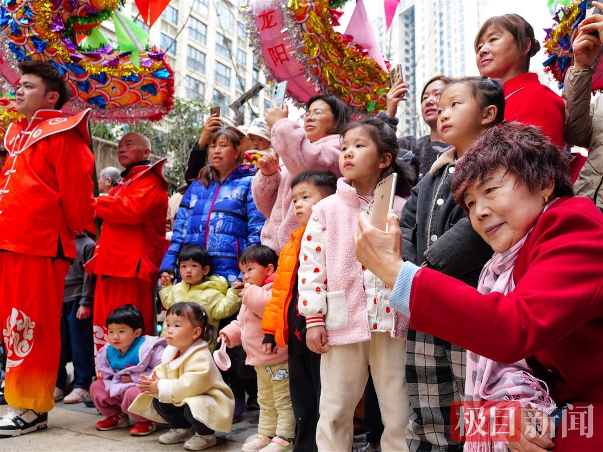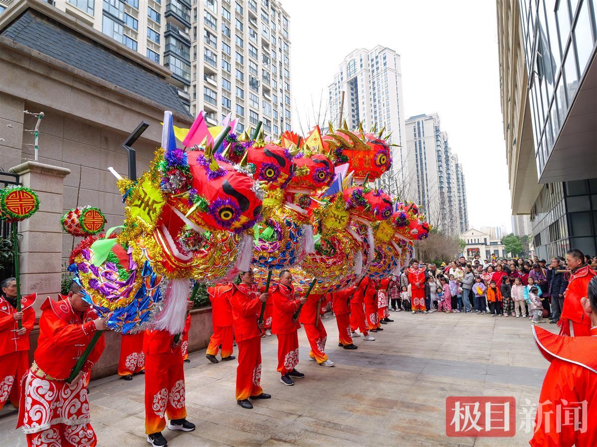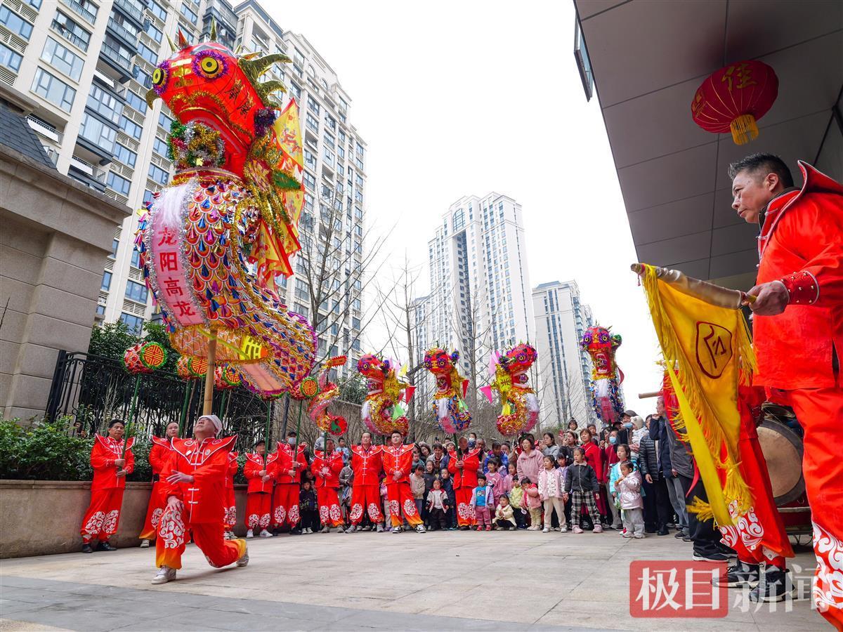 2月18日,農歷大年初九,武漢市漢陽區龍陽街辦事處附近的廣場上鑼鼓喧天、群龍起舞,當日,龍陽街龍陽新村社區高龍隊的隊員們舞起9條國家級非遺項目高龍,隊員們或頭頂肩扛,或口銜齒托,表演叩龍、舉龍、抖龍等高難度動作,將數十公斤重的高龍舞得活力四射。
