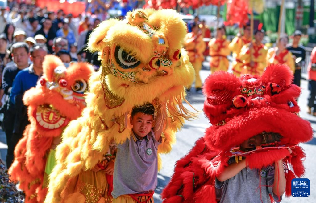 2月18日,貴州省龍里縣的學生在民俗踩街活動中舞獅。