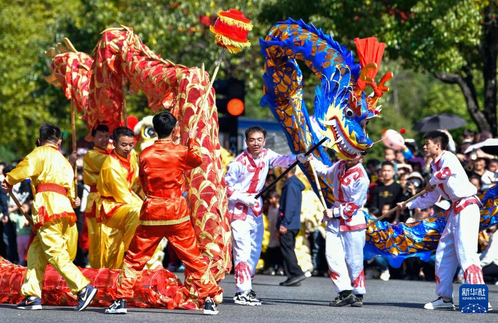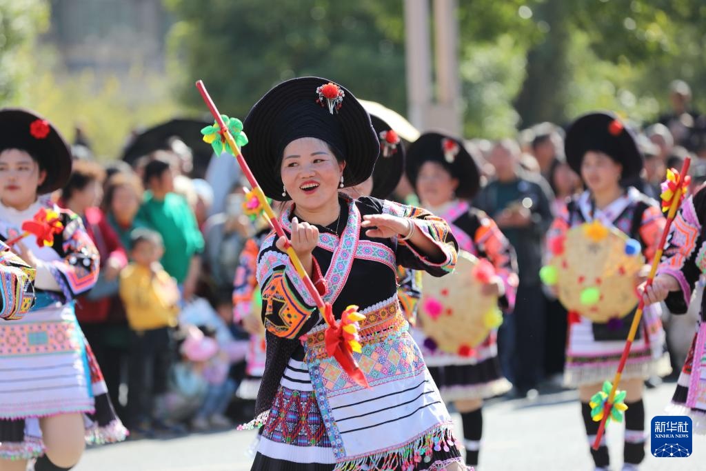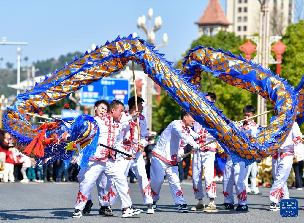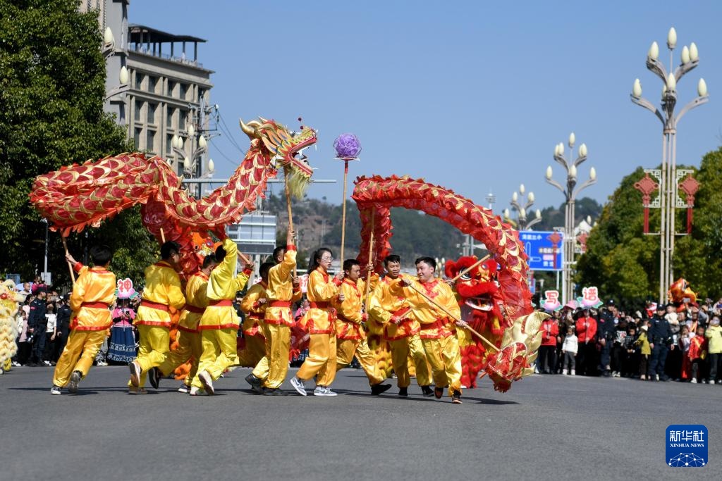 當日是正月初九,貴州省黔南布依族苗族自治州龍里縣舉辦主題為“金龍賀歲·歡歡喜喜過龍年”的民俗踩街活動。