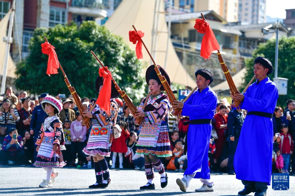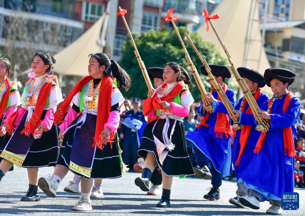 2月18日,人們在貴州省龍里縣民俗踩街活動中跳蘆笙舞。