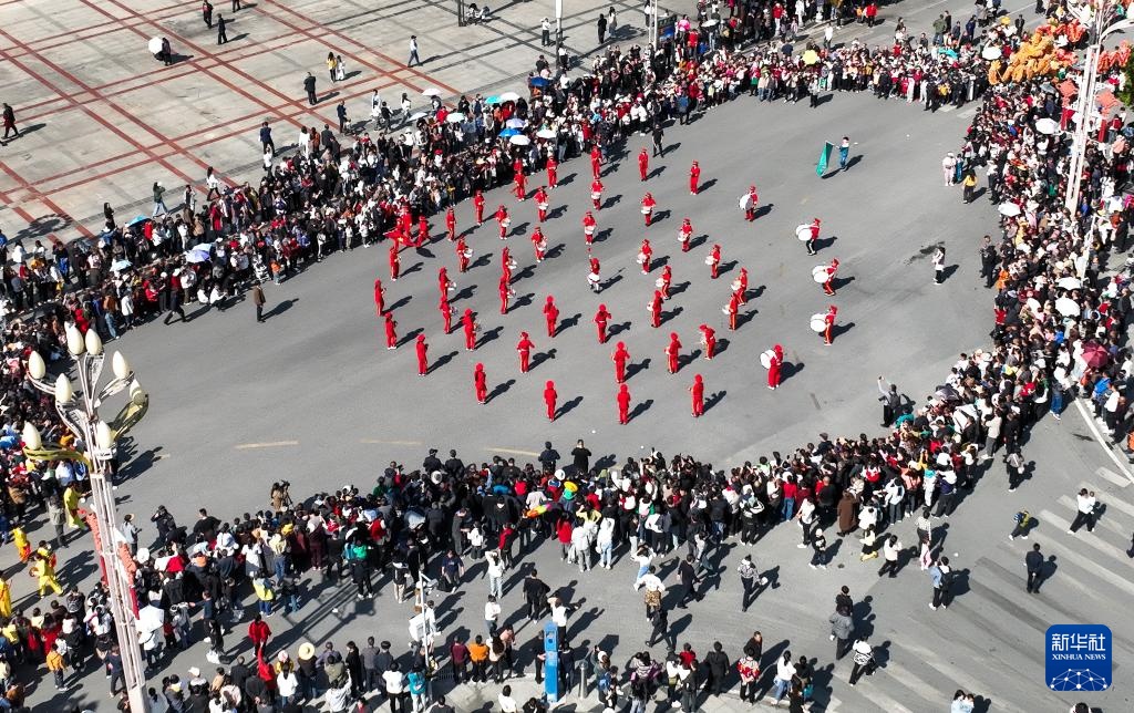 2月18日,人們觀看貴州省龍里縣民俗踩街活動(無人機照片)。