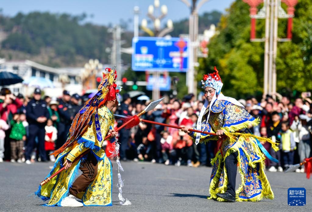 2月18日,人們在貴州省龍里縣民俗踩街活動中表演太平花燈戲。