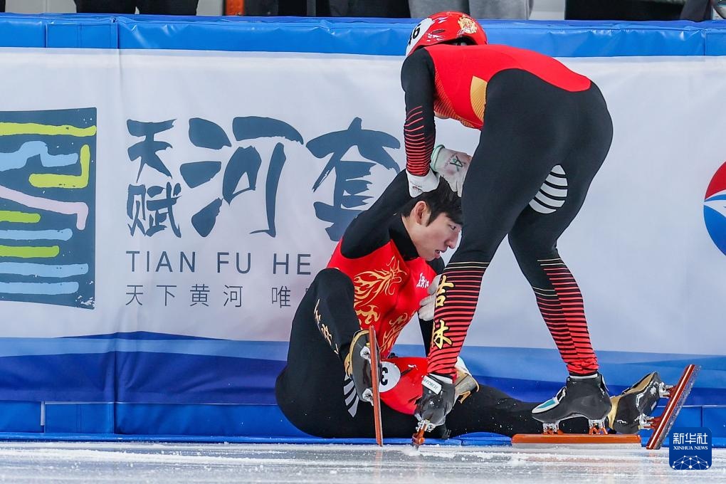 2月18日,孫龍在沖線后扶起摔倒的黑龍江隊選手林孝埈(下)。新華社記者 黃偉 攝