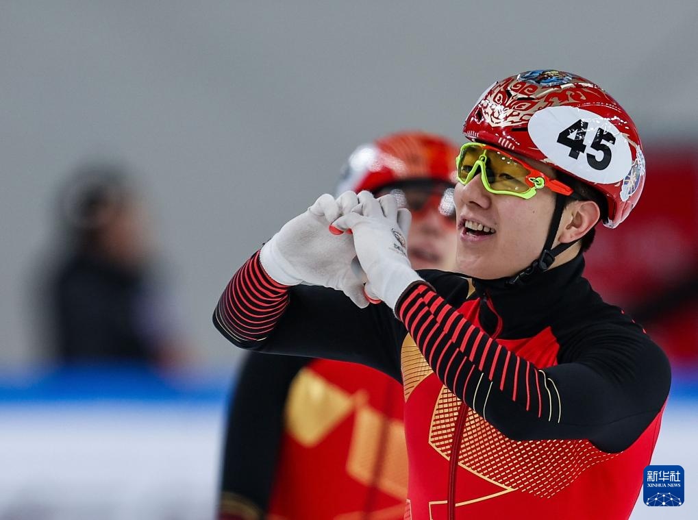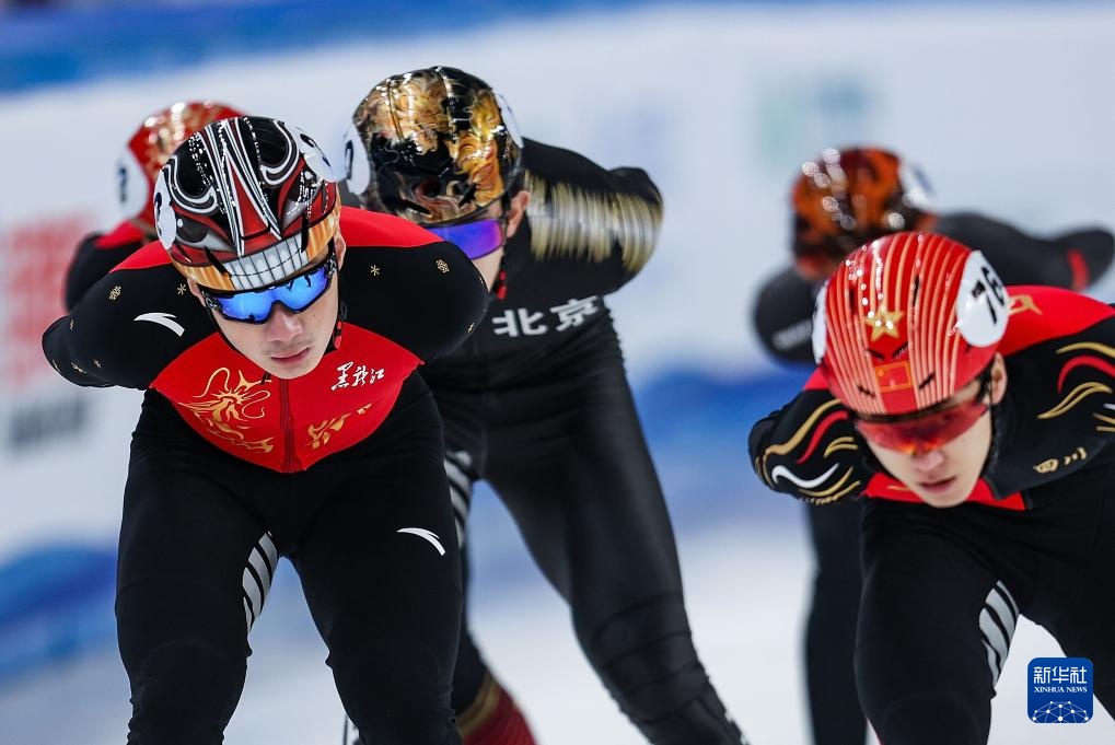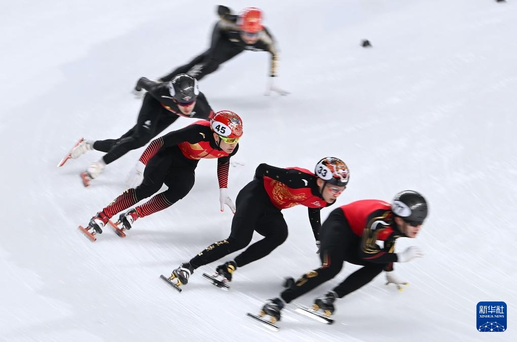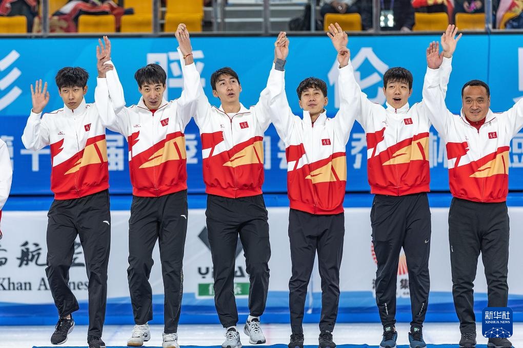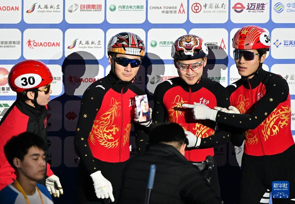 2月18日,黑龍江隊(duì)選手任子威(上排右三)在比賽中。新華社記者 連振 攝