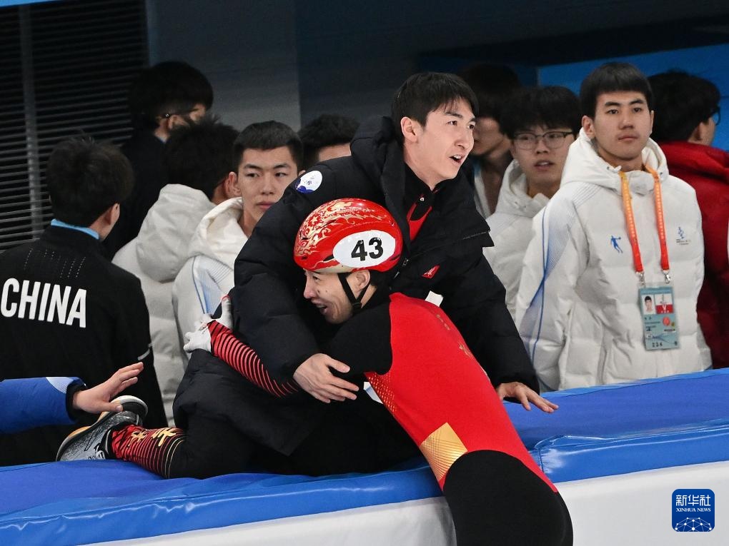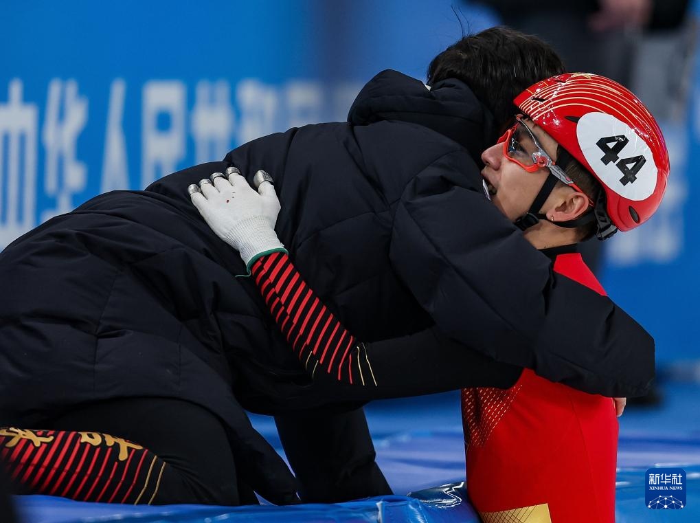 2月18日,吉林隊(duì)選手韓天宇(右)賽后與隊(duì)友武大靖擁抱慶祝。新華社記者 黃偉 攝
