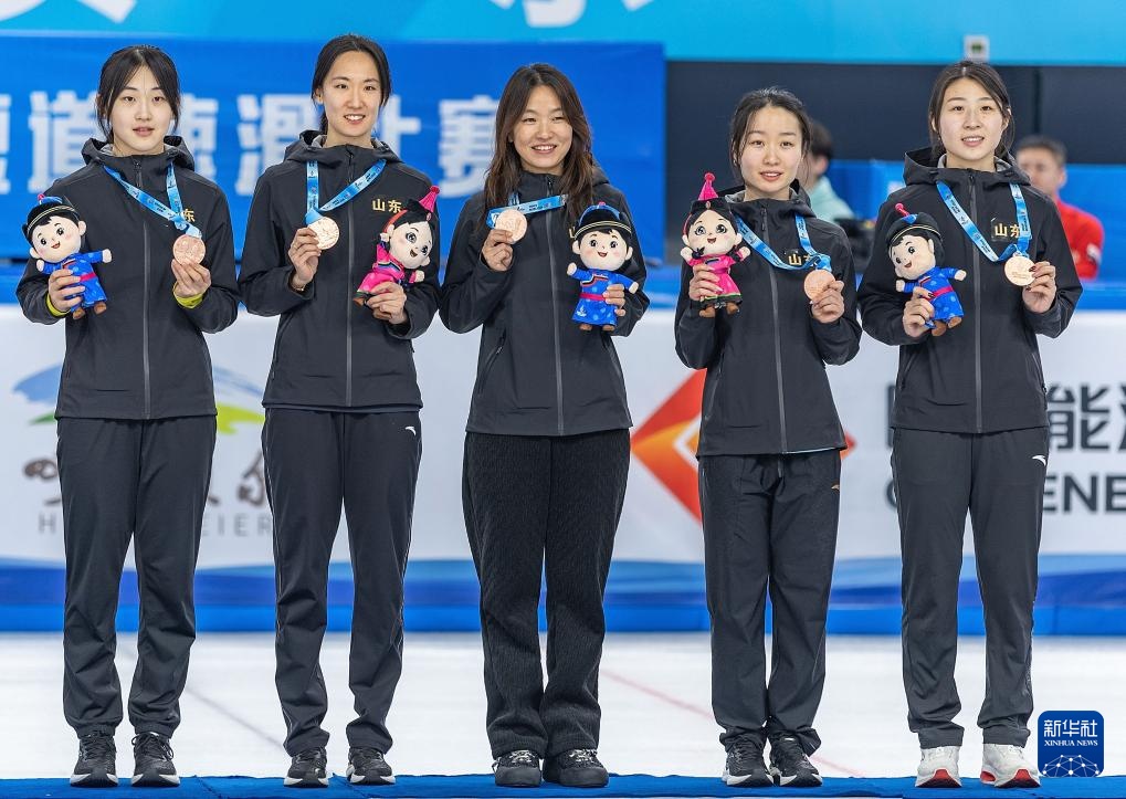 2月18日,山東隊在頒獎儀式上展示獎牌。新華社記者 黃偉 攝